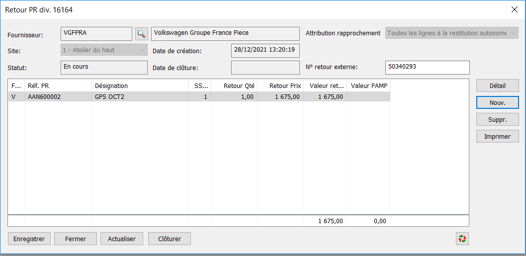 Sélectionner Retour PR div. est choisir VGFPRA – Cliquer sur OK